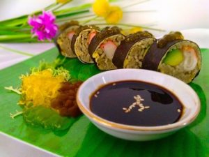 - Ambil 75 gr mie, susun rapi diatas nori, letakan potongan alpukat dan crab cake, kemudian gulun.